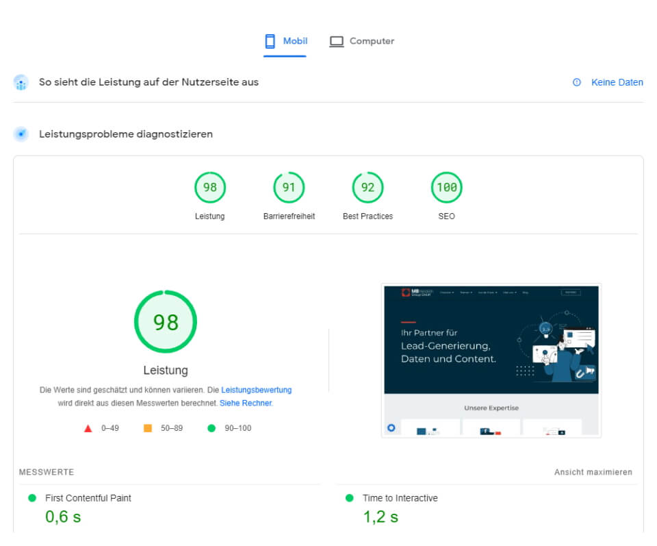 Weitere konkrete Handlungsempfehlungen hinsichtlich der Geschwindigkeit erhalten Sie, indem Sie Ihre Website mit Tools wie PageSpeed Insights oder webpagetest.org analysieren.